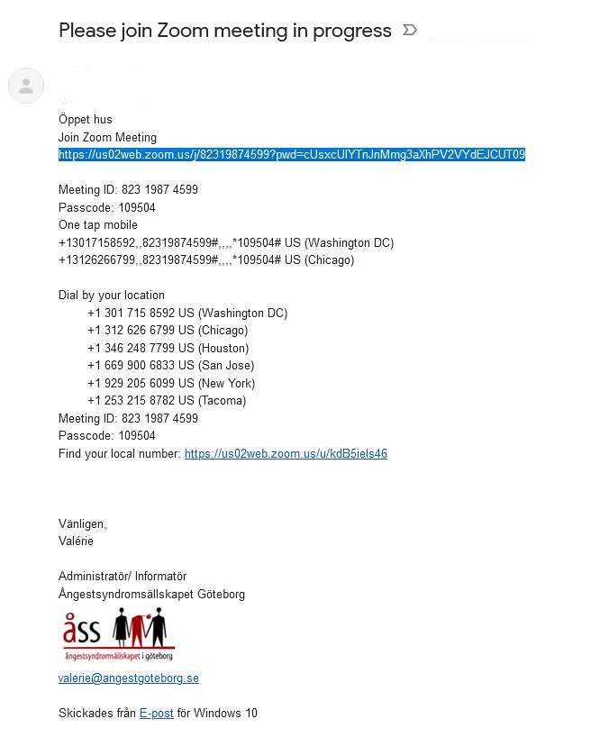 För att delta på ett videomöte i Zoom behöver du anmäla dig via e-post till valerie@angestgoteborg.se. Då får du strax innan mötet börjar ett mejl med en länk som ser ut som på bilden i kapitel 3 nedan (Alt-tangent + bakåtpil för att hoppa tillbaka hit efter du klickat på länken).