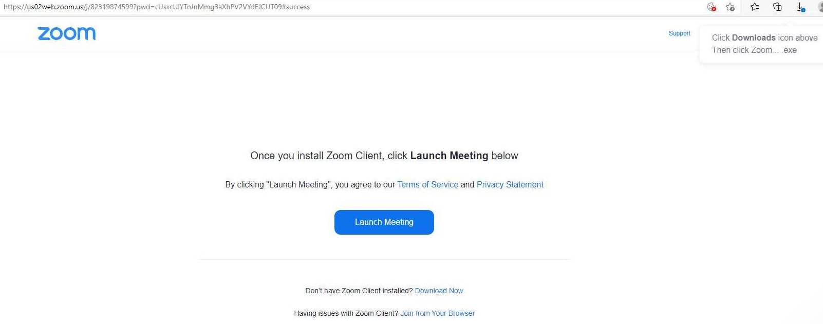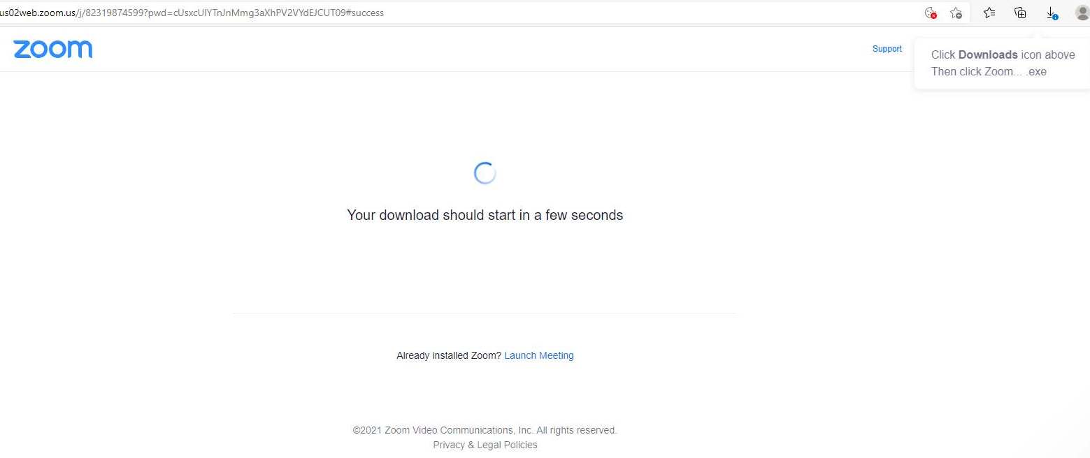 Bild 3: Då kommer du till följande sida. Uppe till höger på den sidan kommer det upp en liten dialog ”Click Downloads icon above…” (eller på svenska om du har svenskt operativsystem/webbläsare), dvs klicka på den lilla nedåtpilen på verktygsraden ovanför (som också har ett mycket litet blått utropstecken vid sig på bilden). Följ de anvisningarna om du vill installera Zoom-klienten och köra Zoom-mötet med den. Om du vill köra Zoom i din webbläsare så klickar du istället på länken ”Launch Meeting” längst ner på följande bild.