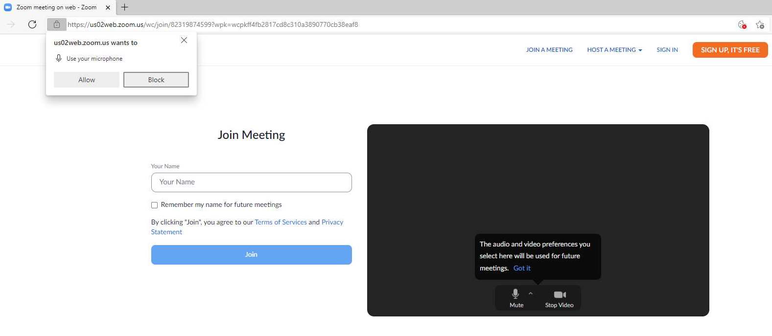 Bild 5: Nästföljande sida ser ut som nedan. Här behöver du först klicka ”Allow/Godkänn” i den lilla dialogen som kommer upp uppe till vänster avseende ”Use your microphone”. Troligtvis får du två dialoger efter varandra som du behöver godkänna, en för mikrofonen och en för webbkameran. Eller kanske var det bara en förresten? Dessa rättigheter behövs för att du ska kunna höras och synas förstås.