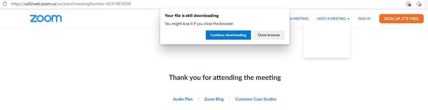 Bild 8: Om du kört mötet i din webbläsare så kommer du till denna sida efter att du lämnar mötet. Där klickar du på knappen ”Close browser” för att undvika att ladda ner installationsfilen för Zoom (som du ju valde att inte använda). Men det verkar som sagt kunna se lite olika ut beroende på dator, webbläsare, inställningar man har i sin webbläsare osv.